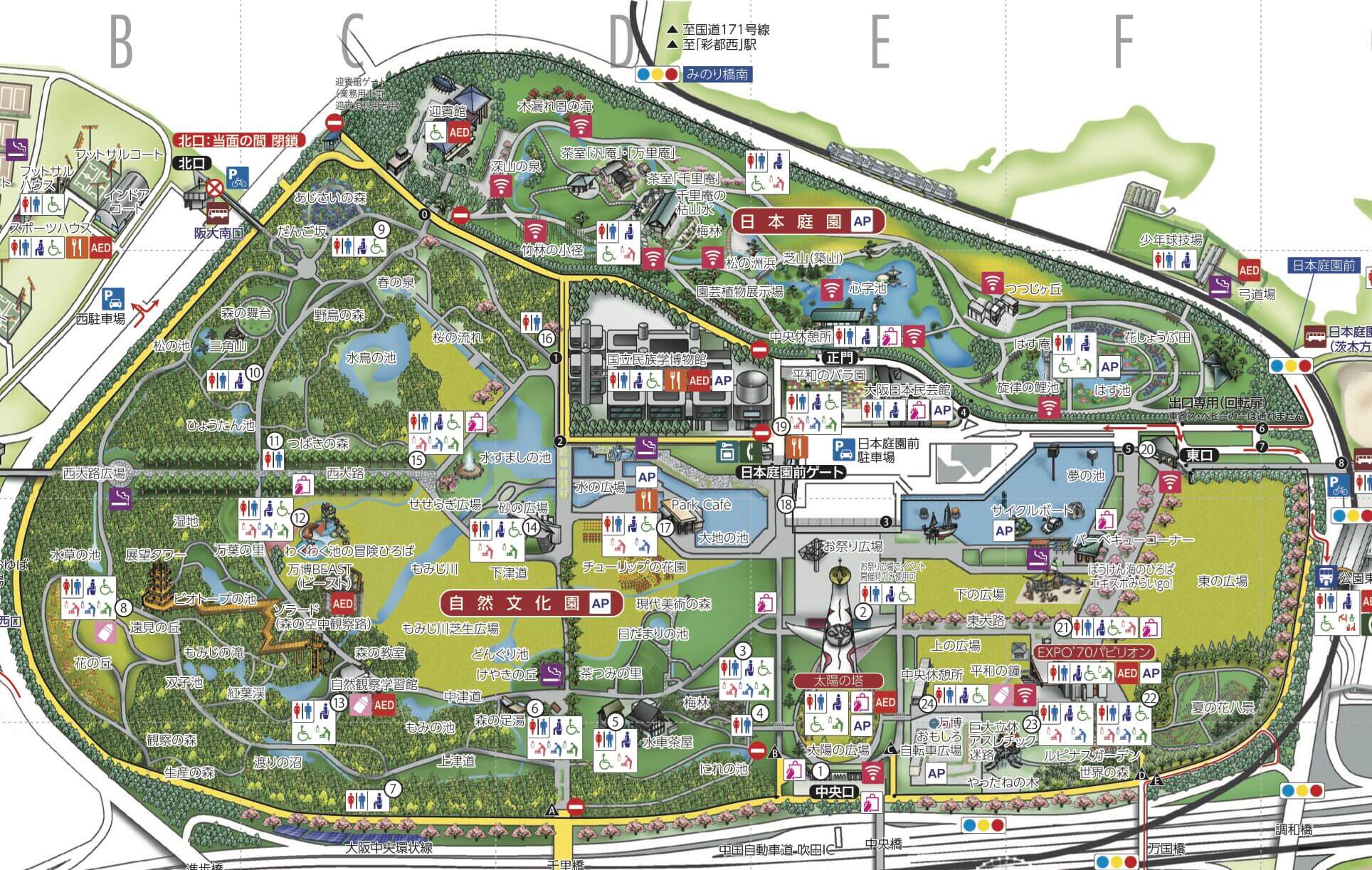 中央口に行くには、大阪モノレール「万博記念公園」駅から歩いて5分程度のところにあります。