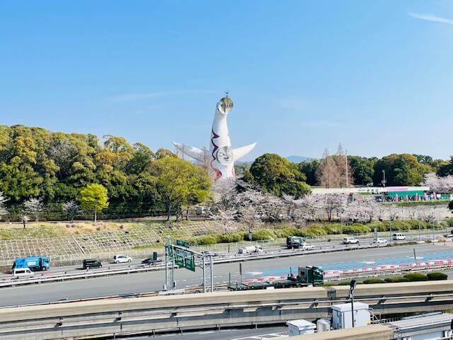 中央口に向かう道から太陽の塔と共に桜も見えたりして、テンションが上がります!