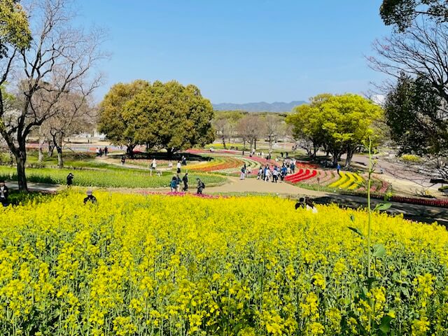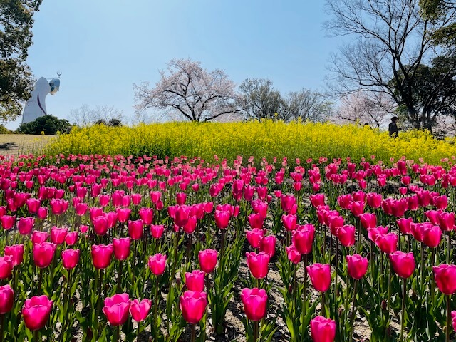 チューリップの花園から太陽の塔の方向にチューリップ、菜の花、桜の木も1本あり、タイミングが合えばチューリップと菜の花と桜の三重奏越しに太陽の塔の上部が見えるのも絶景です。