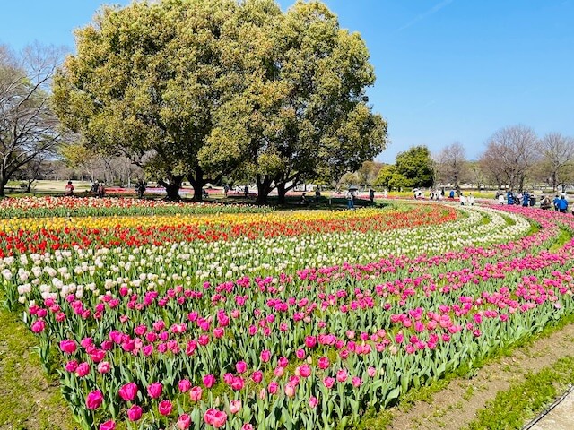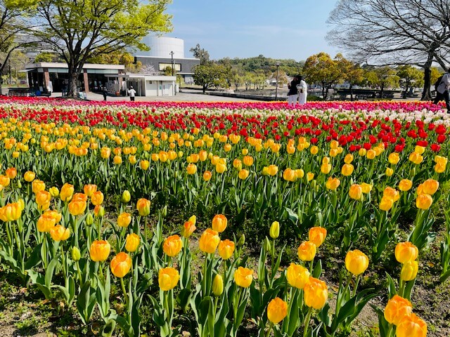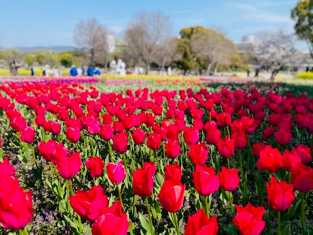 太陽の塔の西側、太陽の塔を挟んで東大路の反対側に、色とりどりのチューリップがたくさん咲いていて、とてもテンションが上がるスポットです!