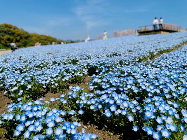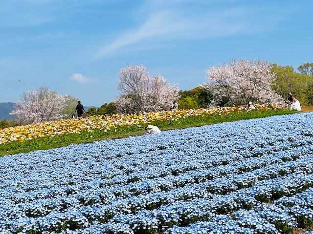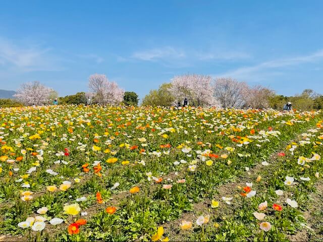 一番の見どころはネモフィラとポピーの花畑!それ以外にも桜も数本咲いていたり、菜の花も端の方に咲いていました。