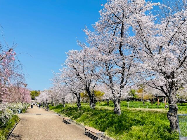 万博公園内に桜はいたる所に咲いていますが、特に名所となっているのは「東大路」「桜の流れ」がおすすめです。
